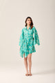 A stylish aqua mini dress with an asymmetrical hemline and floral pattern. Lightweight and chic, ideal for casual outings or semi-formal gatherings. |