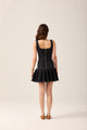 A trendy black denim mini dress with contrast stitching, ruffle hemline, and front button closure. Perfect for casual outings or party wear. |