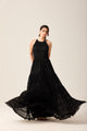 A dramatic black maxi dress with structured pleats and a halter neckline, perfect for elegant evening occasions. |