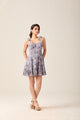 A sweet lilac mini dress with delicate floral patterns, featuring tie-up straps and a ruffled hem for a playful, feminine silhouette. |
