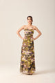 A fitted abstract maxi dress featuring a high slit and strappy neckline, blending earthy olive tones with hints of purple for a striking evening look. |