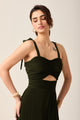 A chic olive jumpsuit with ruched detailing and a cutout front, designed in flowy pleated fabric for effortless elegance. |