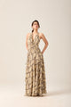 A bold snake print maxi dress with cascading ruffles, creating a statement look for evening parties or resort wear. |
