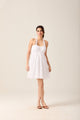 A crisp white halter mini dress with a ruched bust and flared silhouette, perfect for beach parties and summer days. |